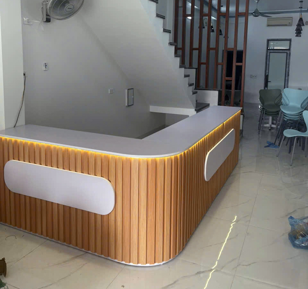 Mẫu quầy bar cafe chữ L này được thiết kế với kiểu dáng hiện đại, sang trọng, phù hợp với nhiều phong cách quán cafe khác nhau, từ cổ điển đến hiện đại, từ đơn giản đến cầu kỳ. Hình chữ L tối ưu hóa không gian, tạo sự thuận tiện cho cả khách hàng và nhân viên phục vụ.